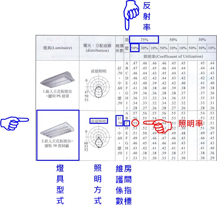 - 精算 U:查表照明燈具之照明率 ( U )